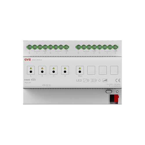 1/2/4 路通用調(diào)光執(zhí)行器(以下簡稱調(diào)光器)根據(jù)產(chǎn)品有 1/2/4 路輸出,可連接一些具有可調(diào)光性能的燈光設(shè)備(如白熾燈、鹵素燈、節(jié)能燈、LED 燈等),通過總線可以對這些燈光設(shè)備進行調(diào)光、場景預(yù)設(shè)、開關(guān)燈等操作,同時也支持 KNX 安全協(xié)議。采用導(dǎo)軌式安裝的調(diào)光器設(shè)計安裝在 35 毫米 DIN 導(dǎo)軌上的模數(shù)化設(shè)備,輸出端采用螺絲接線柱實現(xiàn)電氣連接。調(diào)光器的總線連接都是直接通過 KNX 接線端子連接,系統(tǒng)供電除總線外不需要額外的電源電壓。