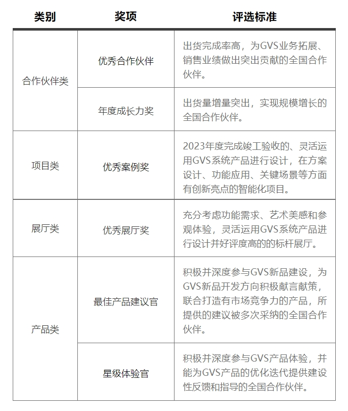 本次頒獎(jiǎng)活動(dòng)共設(shè)立4大類6大獎(jiǎng)項(xiàng),GVS的全國(guó)合作伙伴均有機(jī)會(huì)參與所有獎(jiǎng)項(xiàng)的競(jìng)逐。