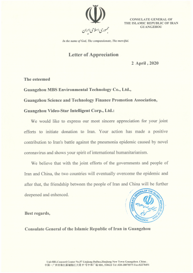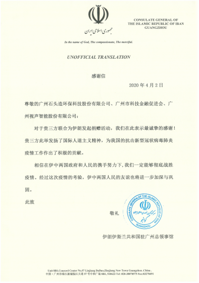 常言道:錦上添花易,雪中送炭難。對(duì)于GVS視聲、廣州市科技金融促進(jìn)會(huì)和廣州石頭造環(huán)保科技股份有限公司援助伊朗的溫暖行動(dòng),伊朗駐華使館和伊朗駐廣州總領(lǐng)事館分別發(fā)來感謝信。