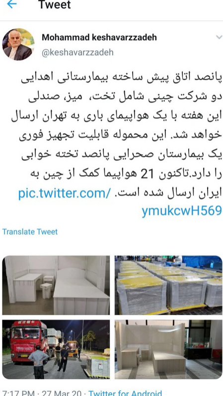 3月26日,這一批抗疫物資正式啟運(yùn),支持伊朗抗擊新冠疫情,伊朗大使亦在推特中致予了感謝之情。