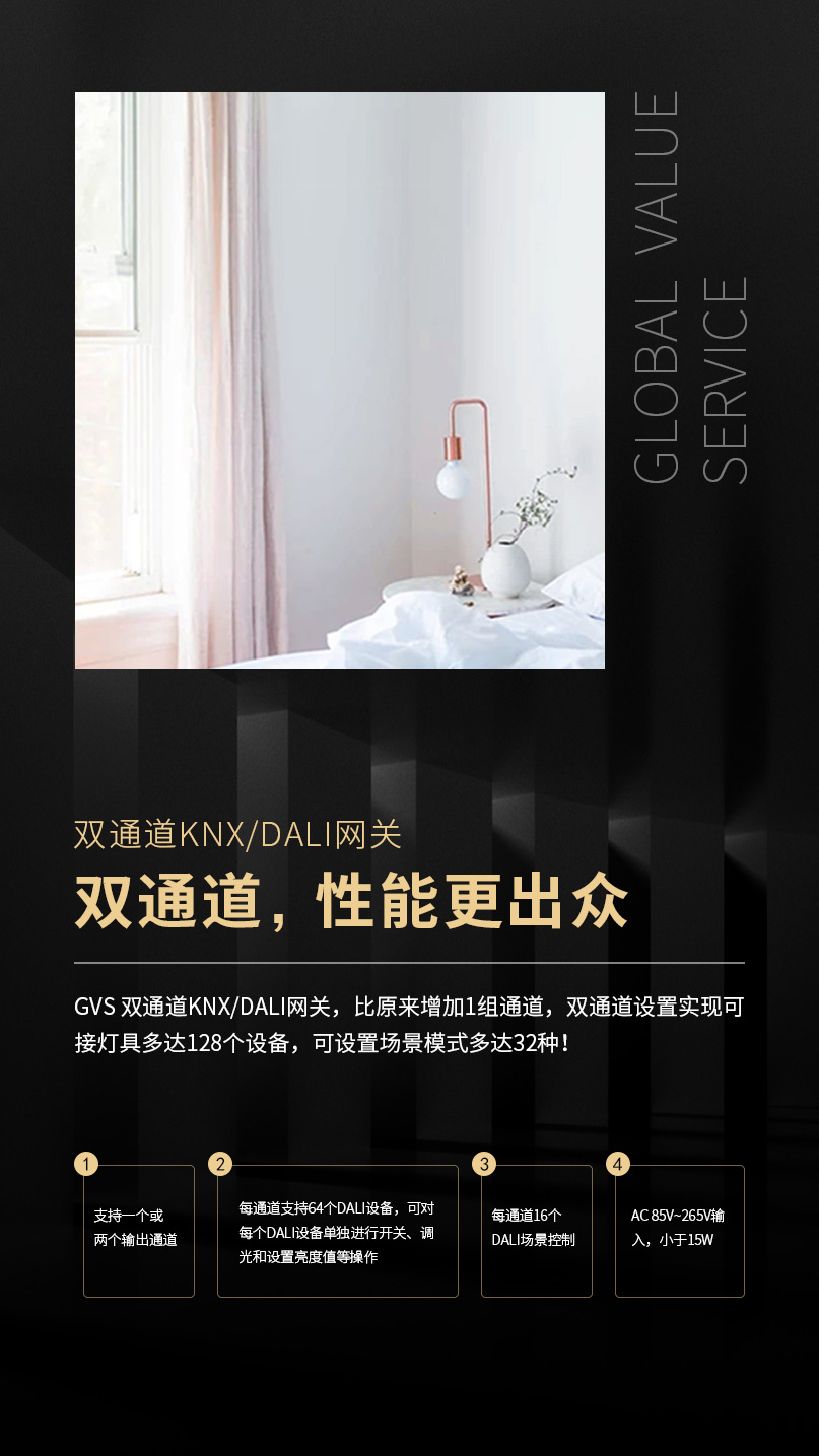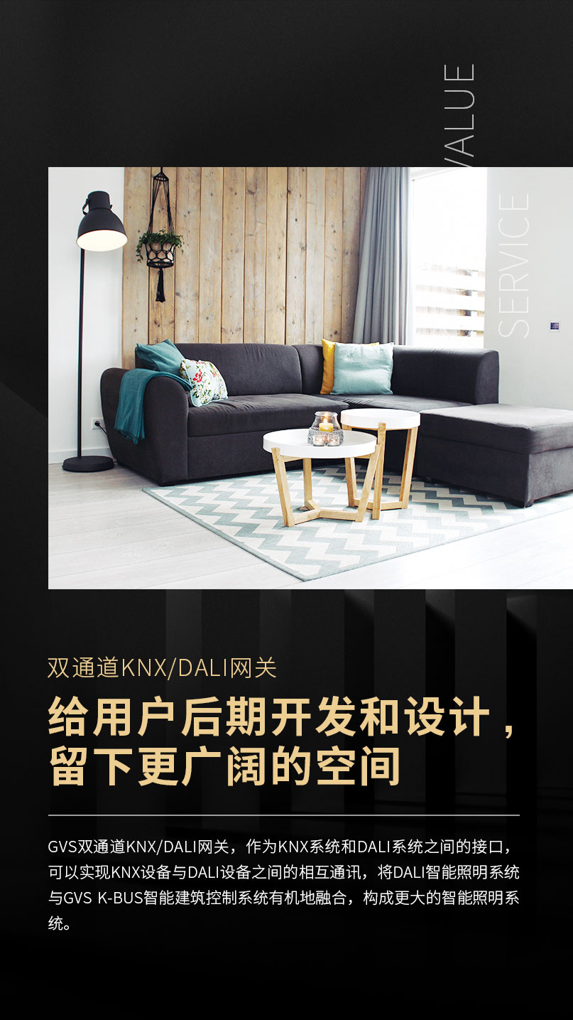作為KNX領(lǐng)域著名的技術(shù)流派,GVS為市場提供KNX/DALI網(wǎng)關(guān)系列產(chǎn)品。平滑舒適的調(diào)光、調(diào)色溫、調(diào)亮度等燈光效果,為設(shè)計師的開發(fā)與燈光設(shè)計留下了廣闊的空間。